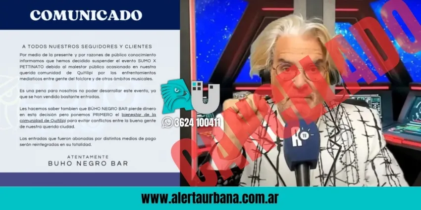 El show de Roberto Pettinato en Quitilipi fue cancelado después de que sus comentarios críticos sobre el folclore argentino provocaran un fuerte malestar en la comunidad. La presentación, parte de su espectáculo "Sumo x Pettinato", estaba programada para llevarse a cabo en el bar Búho Negro.