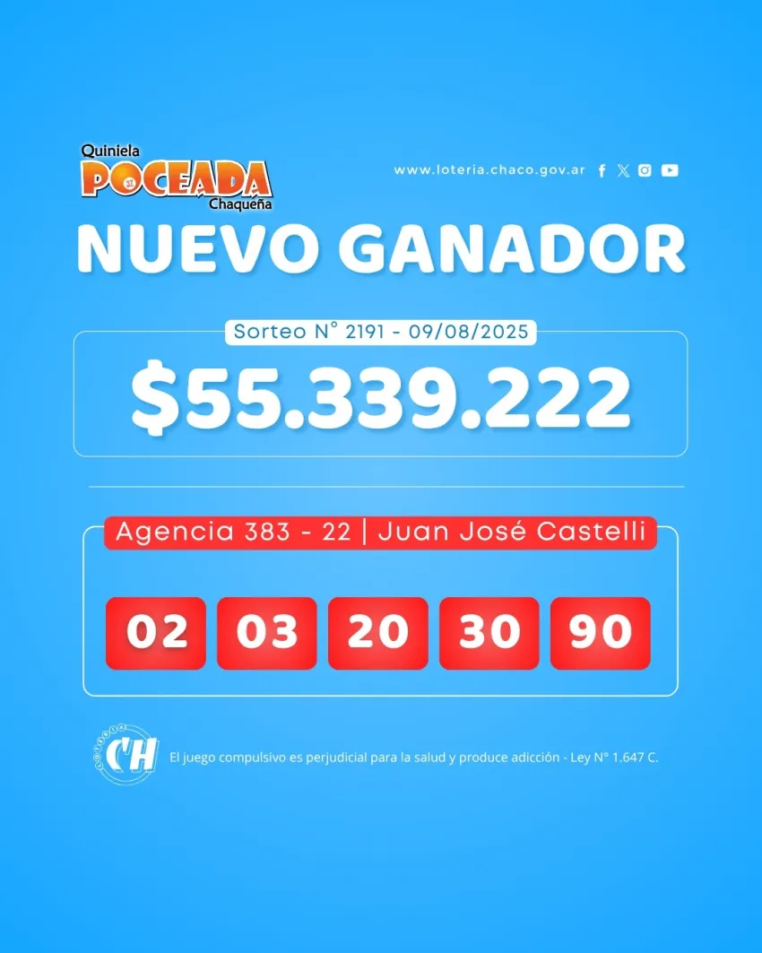 Se efectuó este sábado un nuevo sorteo de la Quiniela Poceada de Lotería Chaqueña y hubo un solo ganador con los cinco aciertos, que se adjudicó un pozo de $ 55,3 millones.