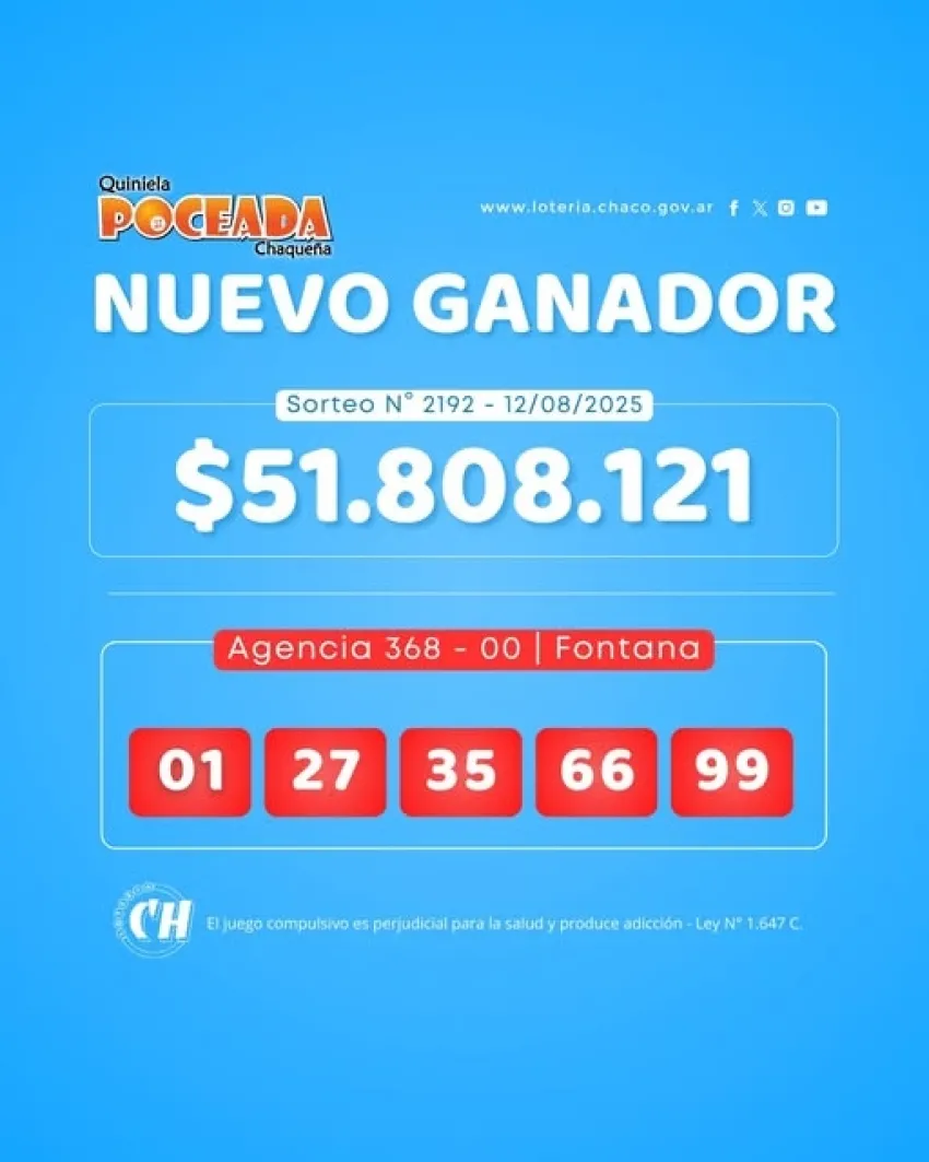 Se efectuó este martes un nuevo sorteo de la Quiniela Poceada de Lotería Chaqueña y hubo un solo ganador con los cinco aciertos que cobrará poco más de $ 51 millones.