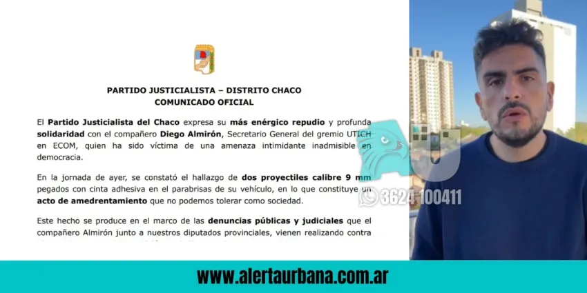 El Partido Justicialista del Chaco expresó este jueves su "más enérgico repudio y profunda solidaridad" con Diego Almirón, secretario general del gremio UTICH en ECOM, "quien ha sido víctima de una amenaza intimidante inadmisible en democracia".