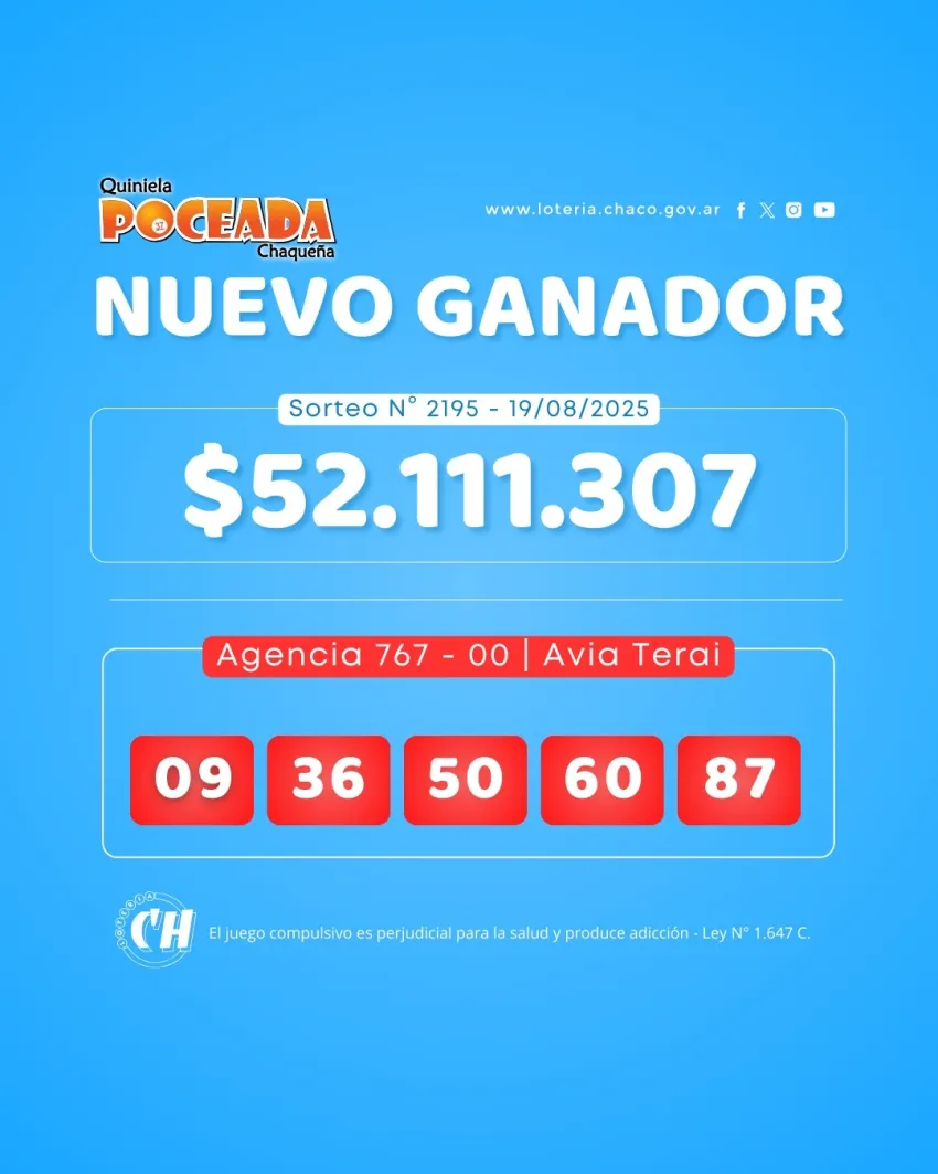 La combinación ganadora fue: 09-36-50-60 y 87 y se jugó en la Agencia 767 de Avia Terai y el poseedor del ticket se hizo acreedor a $ 55 millones. El próximo jueves el pozo tendrá un piso de premio de 37 millones de pesos.