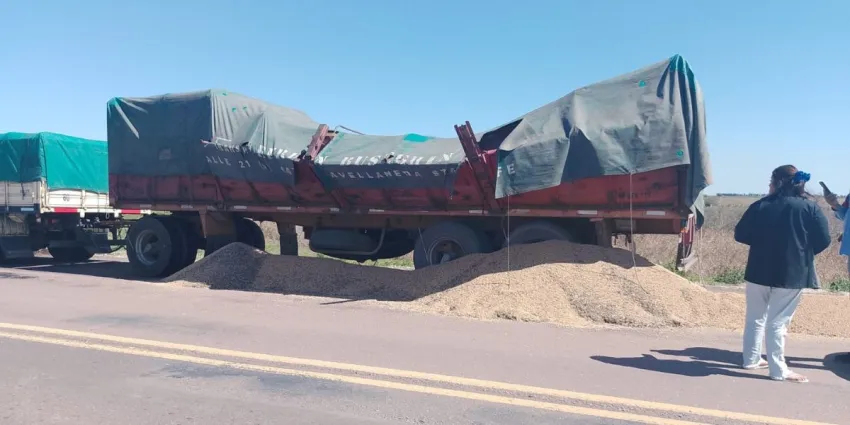 El rodado transportaba cereal a granel (Trigo), por causas que se investigan las puertas del acoplado se abrieron y la carga cayó a la ruta.