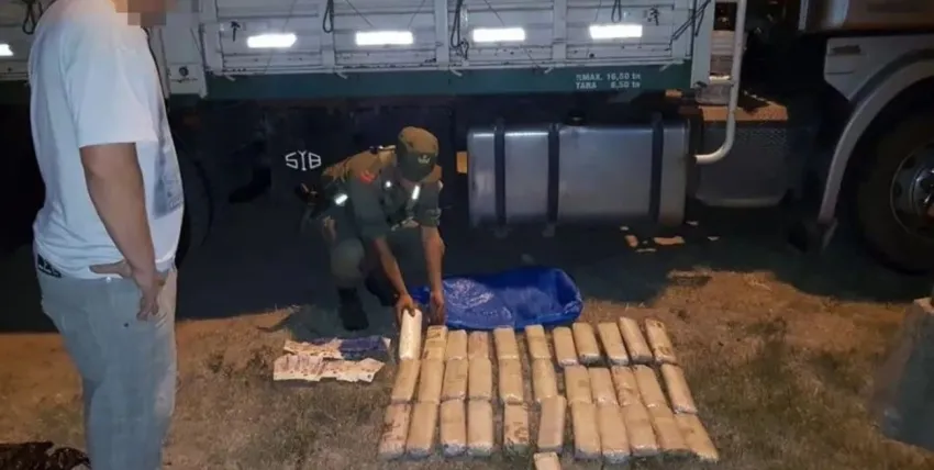 Al inspeccionar el vehículo, los gendarmes detectaron un fuerte olor proveniente de la cabina y descubrieron una bolsa de arpillera azul con 34 paquetes de hojas de coca en estado natural, con un peso total de 16,960 kilogramos.