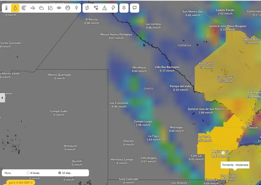Hacia el oeste, en la región de Charata, las lluvias fueron escasas: Corzuela reportó 5 mm, Charata 4 mm y Las Breñas sólo 1 mm. En el sur, la zona de General San Martín presentó valores moderados, con Selva Río de Oro y Pampa Almirón marcando 10 mm cada una, y la ciudad de Gral. San Martín con 7 mm.