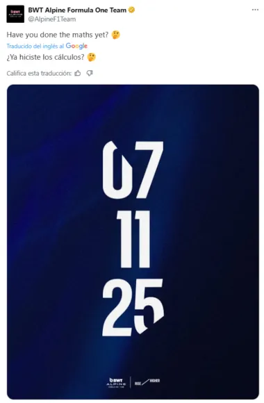 La suma da 43, el número que identifica al piloto argentino. Pero eso no fue todo: el posteo se hizo exactamente a las 20:26, un detalle que muchos interpretaron como otra pista más de que Colapinto seguirá en Alpine en 2026.