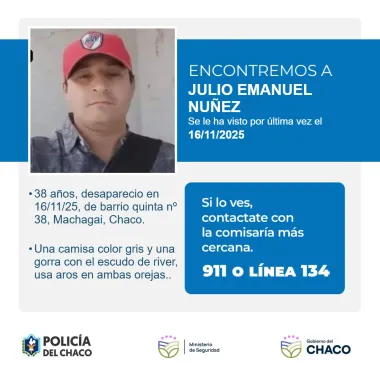 La Policía, a través de un llamado público, solicita a la comunidad que brinde cualquier información sobre el paradero de Julio Emanuel Núñez, de 38 años, quien se encuentra desaparecido desde el domingo en Machagai.