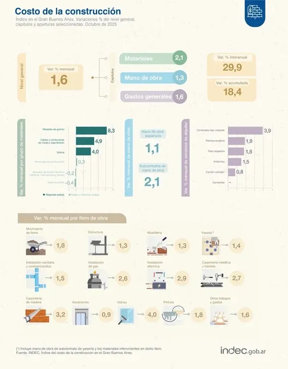El nivel general del Índice del costo de la construcción (ICC) en el Gran Buenos Aires registró una suba de 1,6% en octubre respecto al mes anterior, según informó el Instituto Nacional de Estadísticas y Censos (INDEC).